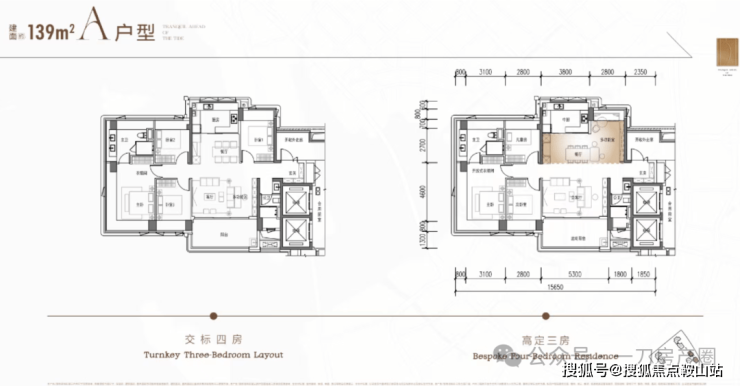 139㎡四房:位于3栋,2梯3户,层高3.1米。有A、B两种户型——A户型为竖厅南北通透,B户型为双龙抱珠布局。两种格局都做到四开间朝南,主卧配备270°无柱转角飘窗,得房率超100%(含赠送)。✅招商海晏府官方售楼处专属热线:400-9098-698