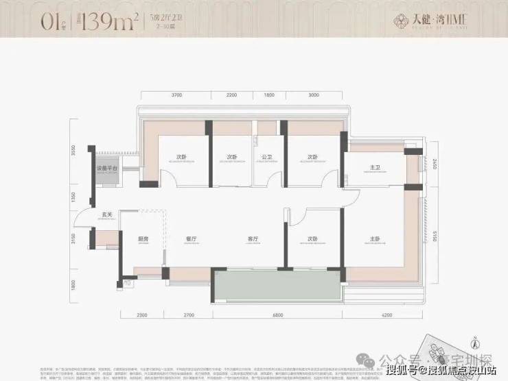 户型为113-114-115㎡四房和139㎡五房,标准层布局与保利瑧誉非常类似,但是没做独立电梯厅,2梯5户使用率高,凸窗做满再加上设备平台,所以赠送后得房率去到100%。