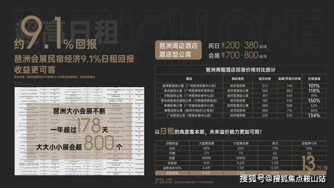 2023年琶洲展会全年举办800场,共178天,以会展租价计算,区域内商办产品一年最高可达13万/年超高收益,民宿经济约 9.1%日租回报 更可喜!