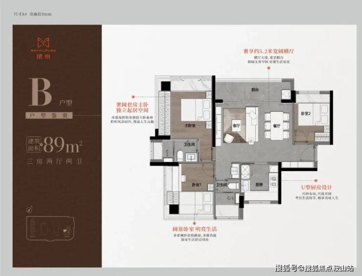 89㎡三房二卫A/B户型,位于1栋一单元,两开间阳台,主卧都有双面凸窗赠送。