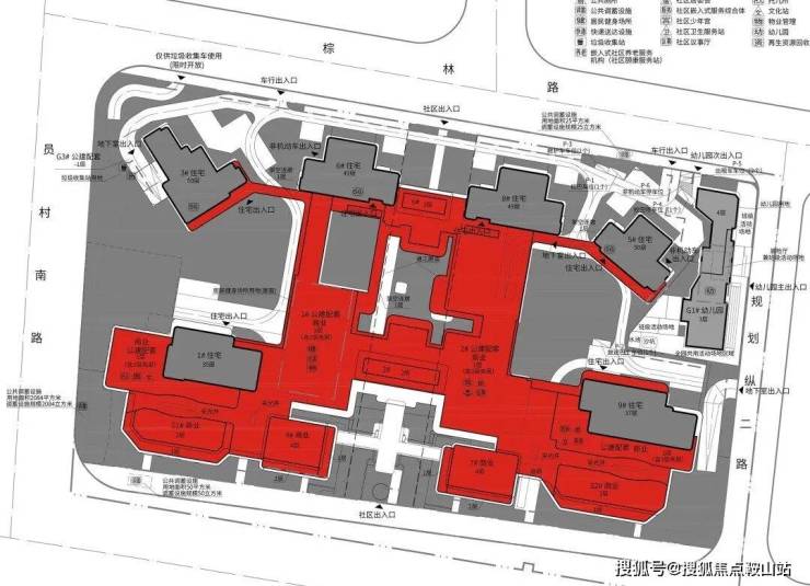 配建巨量底商(红色部分),未来极有可能打造成为会所,顶部承担屋顶花园功能。与其他项目不同的地方在于,其他项目会所往往环绕住宅分布,保利面粉厂项目的会所则渗透全盘。