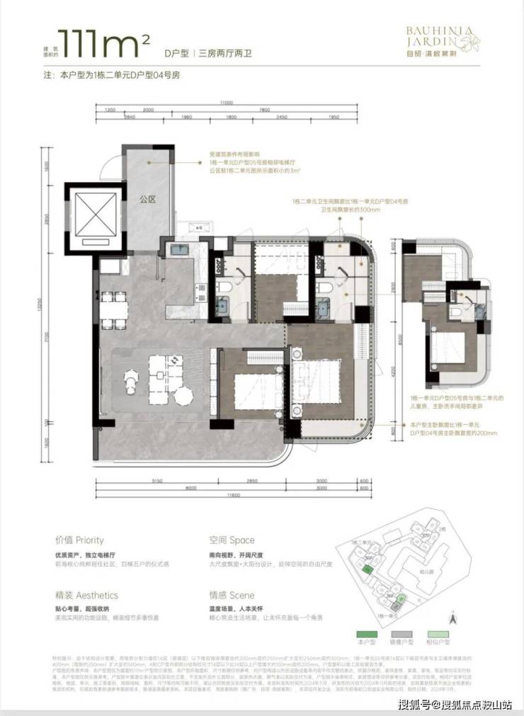 湾啟紫荆府项目位于前海三湾的宜居妈湾,听海望山、社区纯粹。经反复推敲建筑排布、户型格局、室内精装、社区配套等,让居住者体验松弛的人居生活方式。◎位置:听海大道与妈湾一路交汇处西南角◎容积率:约4.47◎层数:36-37层◎梯户比:4梯5户◎车位数量:595个◎套数:共485套◎户型:建面约96/111/122/142㎡3-4房