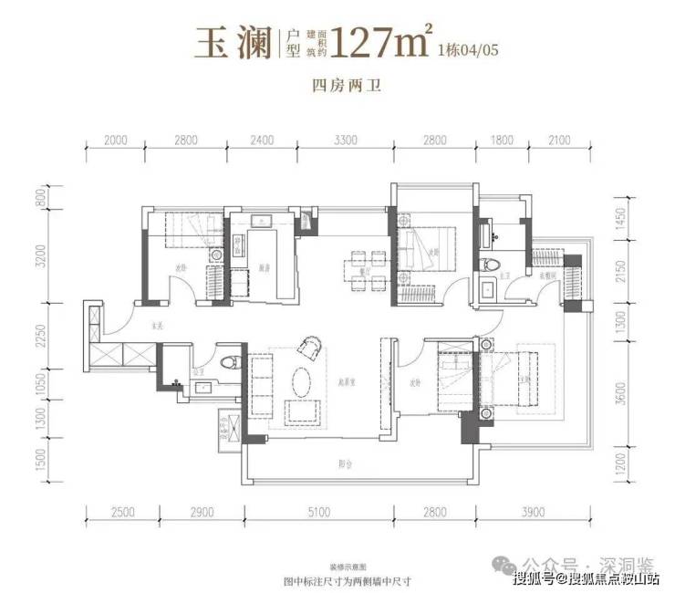 玉澜·建面约127㎡4房2厅2卫:南向四开间,南北通透,约14.7米IMAX光幕,独立衣帽间
