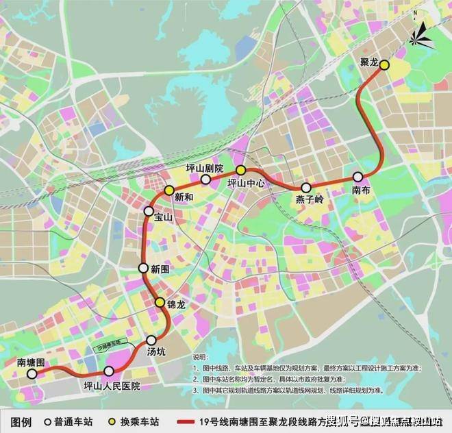 该线路总共规划12座车站,包括南塘围,坪山人民医院,汤坑,锦龙,新围,宝山,新和,坪山剧院,坪山中心,燕子岭,南布,聚龙站,时速80公里。