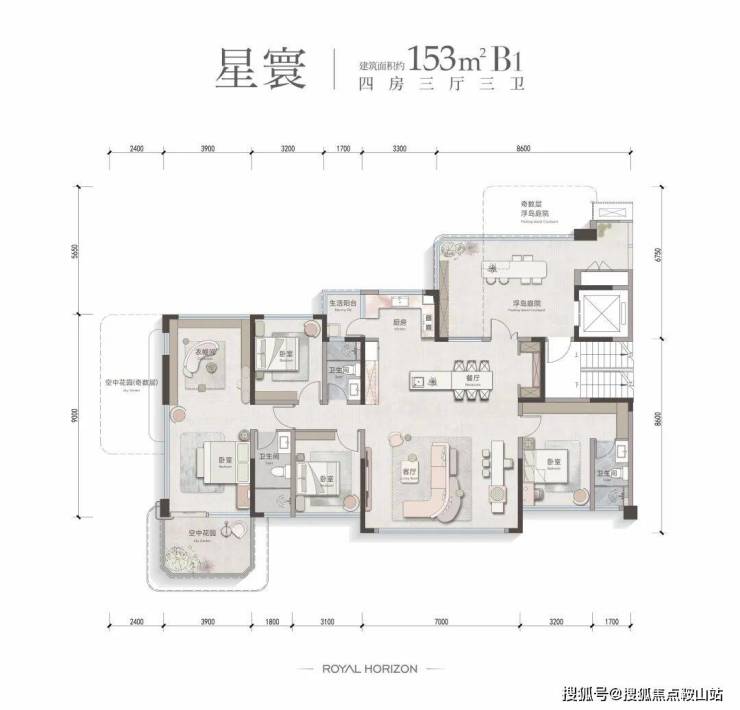 建面约153㎡,为4房3厅3卫设计,在空间尺度上更胜一筹!