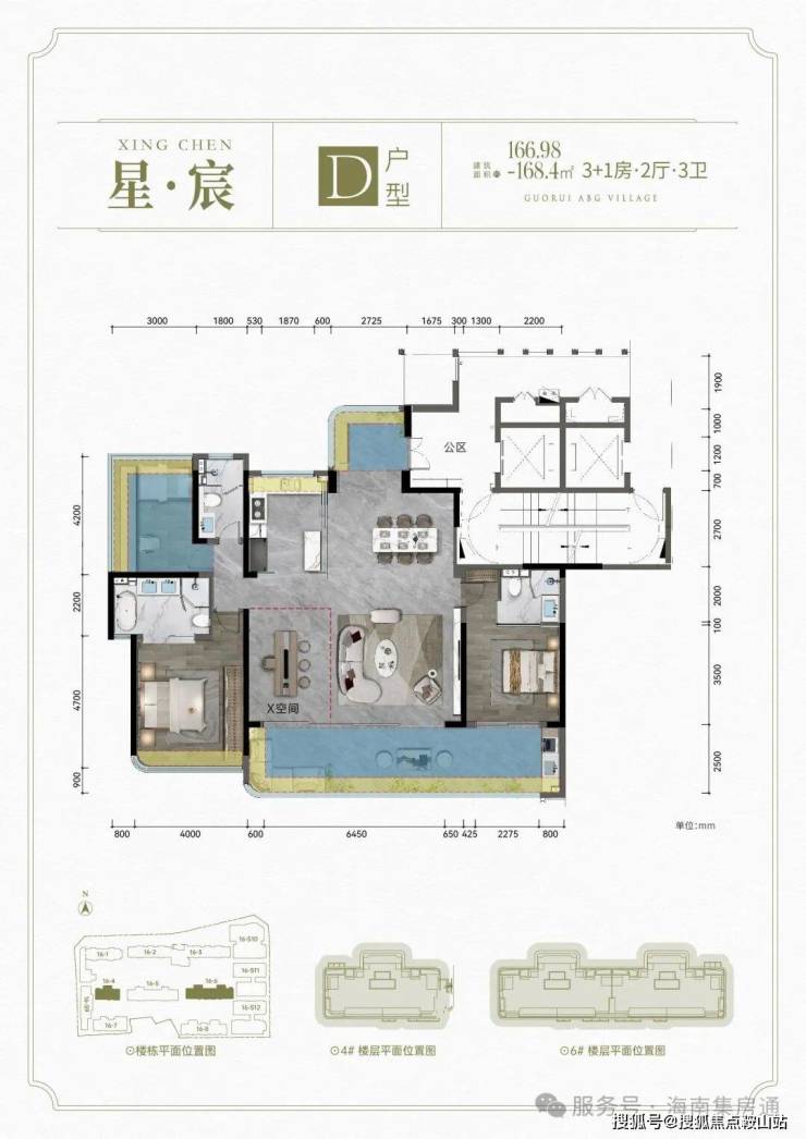 D户型: 建面约167-168㎡ 3+1房2厅3卫