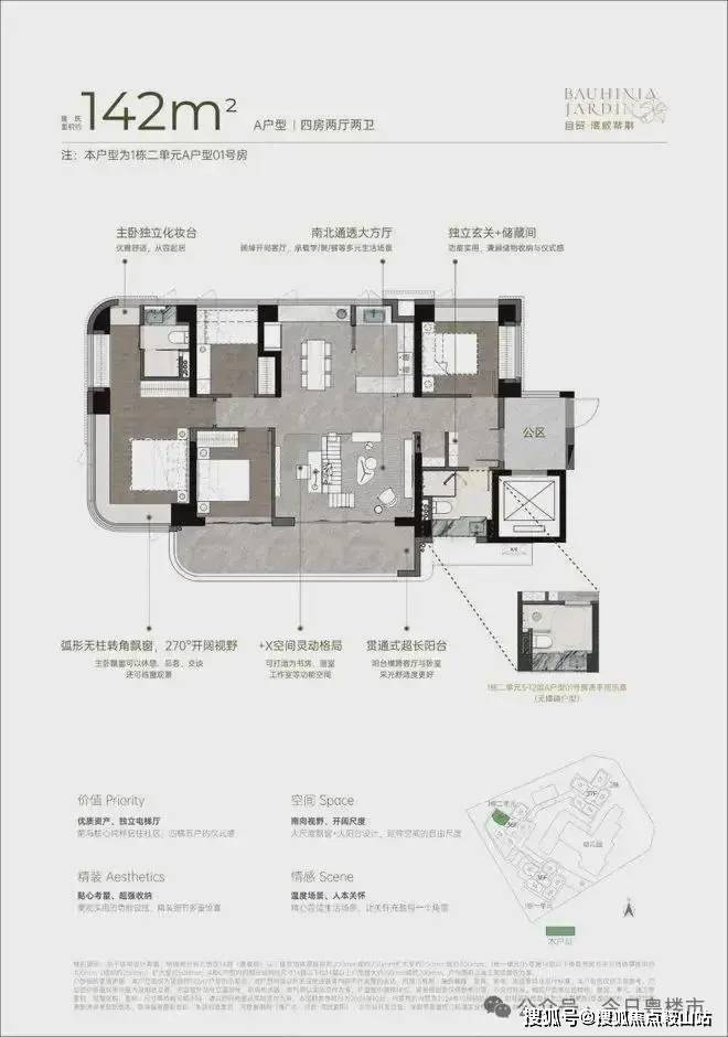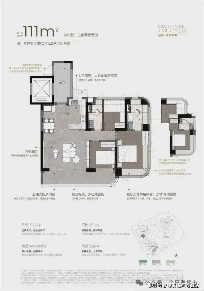双龙抱珠户型,整个户型非常通透。书房分布于客厅另一侧,难得的双面采光+270°景观视野。主卧南北通透,景观面开阔。