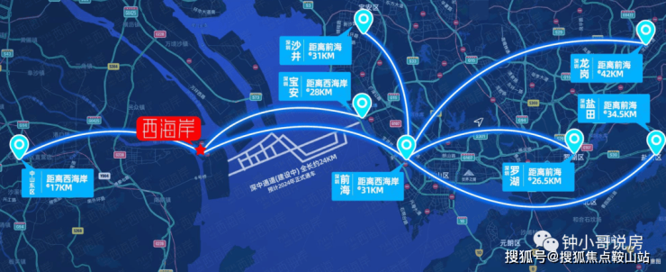 翠亨新区先后投资190亿元加快起步区83.37公里,共计30条道路、22座桥梁的“一环四纵五横”基础路网建设,享受“一码头双桥双站四快线四高速”的立体交通路网;马鞍岛占据交通枢纽位置,约24km深中通道预计2024年通车;中山港新客运码头联通深圳、香港、澳门机场;广州地铁18号线、深圳地铁33号线设站马鞍岛;规划中中山地铁2/4号线双向轨道。西海岸距深中通道口约2km,同步前海生活圈。