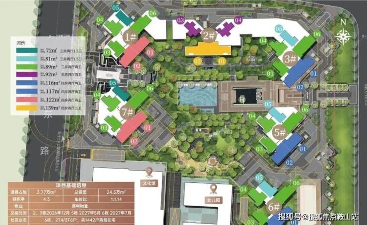 项目采用围合式设计,6栋47层高塔楼设计,小区自身配建有文化体育场馆和幼儿园,除了2#楼王是两梯四户,其余均为三梯六户,8#是5层高的文化馆,9#是配建3层高的幼儿园。