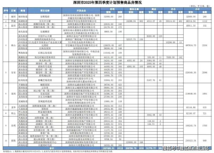 日前,深圳住建局公布了2025年第四季度计划预售的商品房项目。抛开商务公寓、商业和办公,住宅项目共有34个,合计10122套房。
