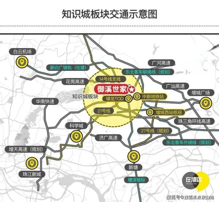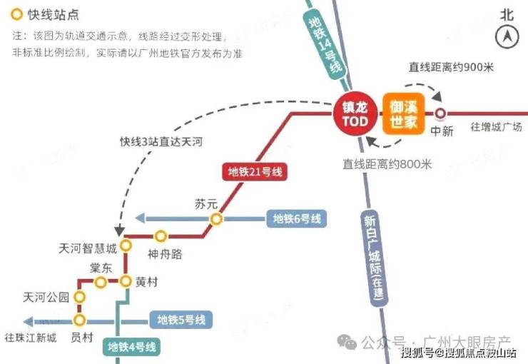 距离地铁21号线中新站(约1000米)、地铁14/21号线镇龙站(约1000米),快线3站到天河,7站到珠江新城。