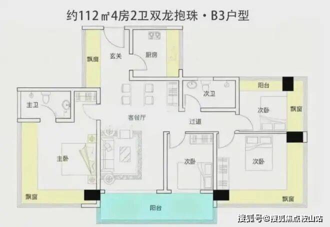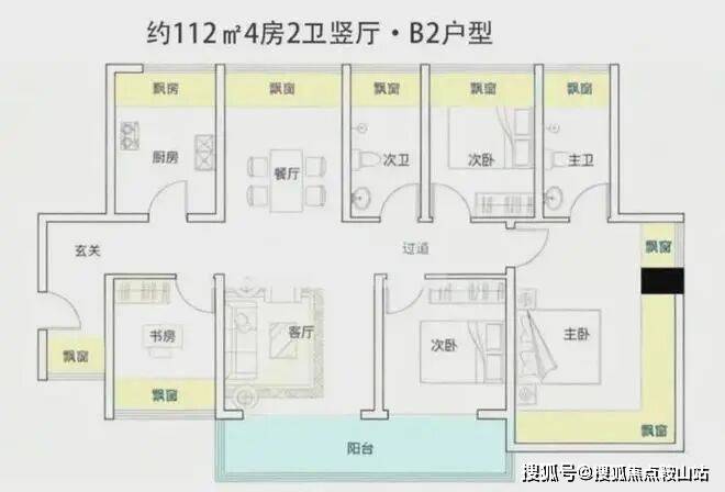 约105-122㎡四房:作为“功能型品质起步”户型,凭借新规下的高实用率(包含赠送得房率约100%)。主卧均带270°环绕式飘窗,户型设计通过飘窗“送了不少面积。