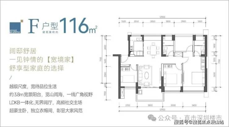 116㎡的4房2厅2卫,F户型,设计的是竖厅南北通透格局,餐客厅一体化设计,客厅3.8米开间,四开间朝南,4个卧室分别做到了主卧18.02㎡/次卧12.3㎡/次卧8.7㎡/次卧8.37㎡(包含墙体飘窗),都不用搭配飘窗做床,L型厨房,卫生间干湿分离,得房率约:88%(包含赠送),阳台主朝西南或东南向。