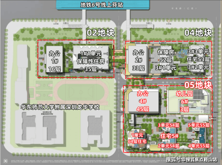 项目分三个(02/04/05号)地块开发建设,整体由4栋53-64F超高层住宅+2栋35-52F保障房+3栋16-45F办公楼,以及1栋3F幼儿园组成。