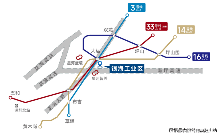 3号线、14号线、16号线环伺和在建的33号线,仅需6个站直达福田CBD,招人才、跑商务不用折腾”。