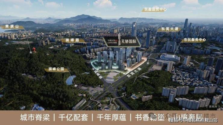 天骄国际位于黄旗山1号地块,坐落于东莞市中心城区罕见的生态资源与城市繁华结合带。项目东南向直面黄旗山,呈现出“清晨伴山、入夜观城”的独特景观体验。