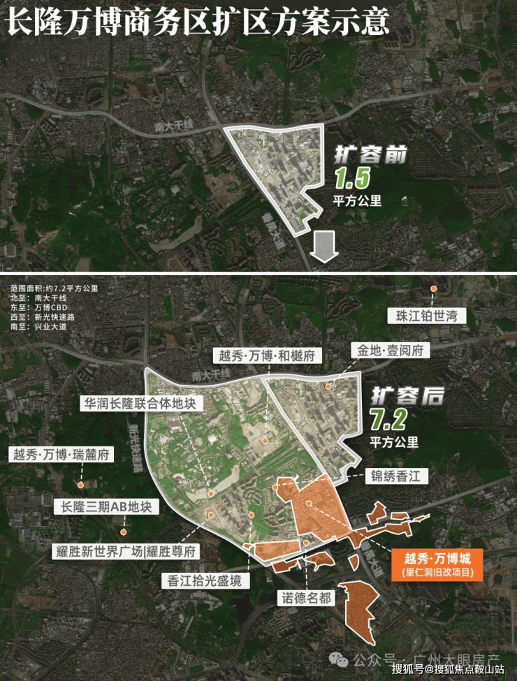 2023年4月,万博官宣扩容,占地面积由1.5平方公里延展至7.2平方公里,覆盖长隆、里仁洞片区,规模甚至超越6万平方公里的珠江新城,剑指世界级地标商圈。