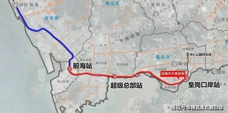 轨道:穗莞深城际轨道2站直达前海,联通两大深港合作区;穗莞深城际(建设中)延长线——穗莞深城际前海至皇岗口岸段设有皇岗口岸站,途径南山、福田等地,建成通车后2站到前海,1站到深圳湾总部基地。
