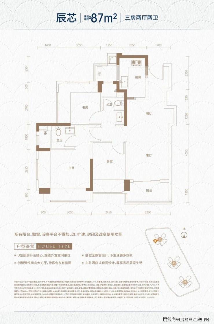 入门级选手,总价门槛最低。LDKB一体化设计,小面积段也能做出大通透感。S墙玄关一体化设计配合烟道外置,释放了更多室内空间。竖厅格局,3.3米客厅开间,三开间朝南,U型厨房带窗户,设备平台也安排上了。得房率约88.34%(含赠送),西南朝向。这个面积段能做三房,深圳市场上不多见,适合新婚夫妻或者纯刚需上车。