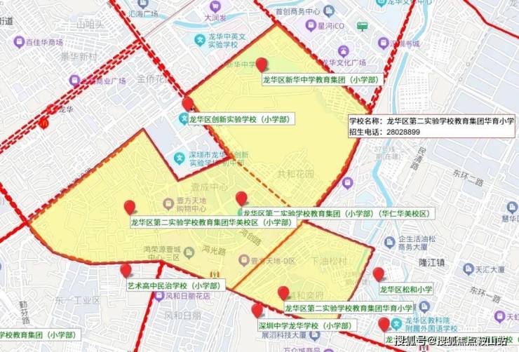 初中学区划分:深圳艺术高中民治学校初中部、龙腾学校北辰校区、龙华高级中学教育集团民治校区初中部、格致中学民治校区初中部、红山中学初中部,还有龙华实验学校初中部的大学区划分。