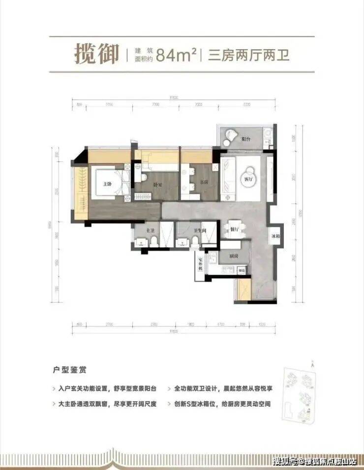 【建面约82㎡的三房两厅两卫】:竖厅三房,动静分区,S型冰箱位,阳台空间比较大,有差不多4.9个平方,主卧双飘窗,带独立卫生间;房间都很通透,采光也好,因为都带飘窗。