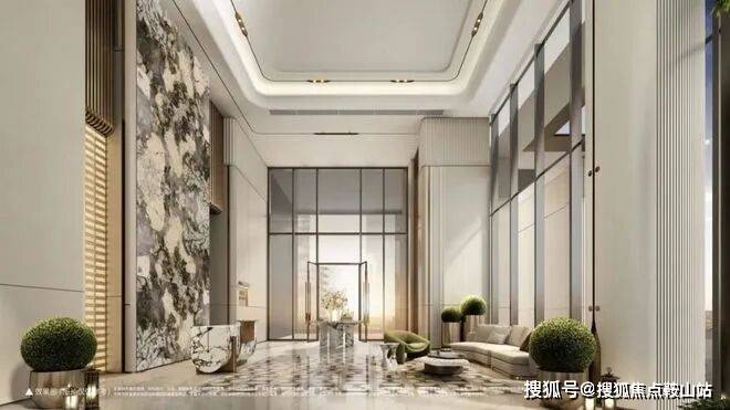 社区还配置了品质高端的双入户大堂和休闲广场,整个大堂挑高约9M,墙面以米白色大理石为主,背景墙面是标志性奢石——潘多拉石材,整体层次感和豪华感营造的非常到位。