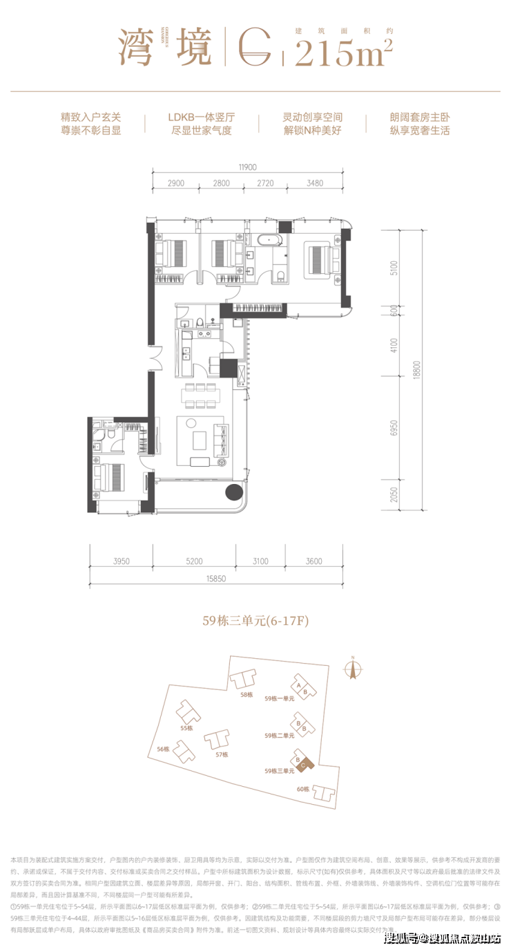 前海桂湾「前海时代尊府」取证加推最后大平层户型,为59栋的三个单元(59-1/2/3栋),面积约为215-255-295㎡,三梯两户,全南向景观,预计2026年交付。