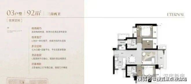 92m²的3房2厅2卫,设计的是双龙抱珠格局,客厅3.2米开间,LDKB一体化宽厅,主卧套房270°环幕凸窗,七大凸窗+设备平台,分别做到了主卧16.06㎡/次卧12.82㎡/次卧6㎡(实测面积,去掉墙体),U型厨房,卫生间干湿分离,得房率超90%(包含赠送),阳台实测6.54㎡正东朝向。