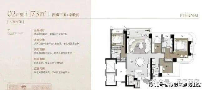 173m²的4房2厅3卫+家政间,设计的是竖厅类双龙抱珠格局,独立电梯厅入户约8.13㎡,客厅5.55米开间,LDKB一体化设计,主卧套房270°环幕凸窗+私享阳台,八大凸窗+设备平台+家政间,分别做到了主卧27.1㎡/次卧14.87㎡/次卧12.38㎡/次卧8.38㎡/家政间2.93㎡+阳台1.38㎡(实测面积,去掉墙体),U型厨房,公卫三段式干湿分离,得房率超90%(包含赠送),阳台9.56㎡正北朝向,看会展中心+市民广场。