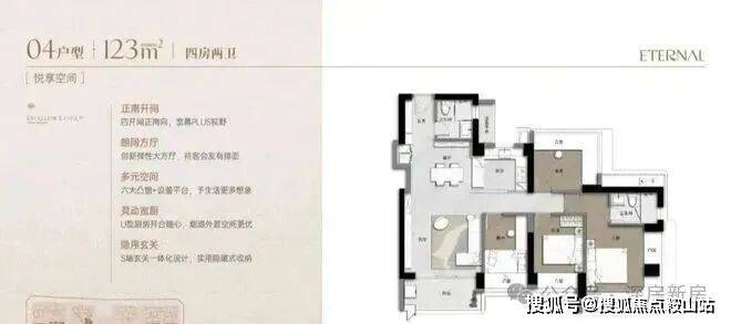 123m²的4房2厅2卫,设计的是经典竖厅格局,客厅4.2米开间,LDKB一体化弹性大方厅,S墙设计预留冰箱卡槽位,四开间朝南,动静分区,主卧套房270°环幕凸窗,六大凸窗+设备平台,分别做到了主卧20.36㎡/次卧10.14㎡/次卧10.04㎡/次卧8.14㎡(实测面积,去掉墙体),U型厨房,卫生间干湿分离,得房率超90%(包含赠送),正南朝向,看皇岗公园。