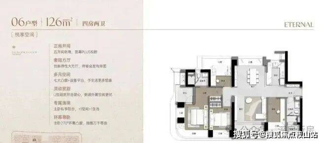 126m²的4房2厅2卫,设计的是竖厅南北通透格局,客厅3.9米开间,客餐厅分离化设计,五开间朝南,主卧套房270°环幕凸窗+私享阳台,七大凸窗+设备平台,分别做到了主卧20.23㎡/次卧9.92㎡/次卧9.3㎡/次卧8.77㎡(实测面积,去掉墙体),U型厨房,卫生间干湿分离,得房率超90%(包含赠送),正南朝向,看皇岗公园。