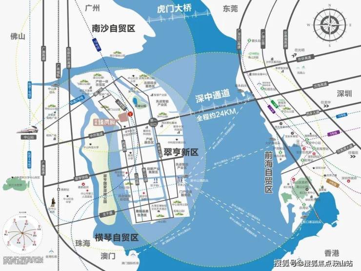 深中通道全长约24公里,是集“桥、岛、隧、水下枢纽互通”于一体的世界级跨海交通集群工程,预计2024年全线通车(信息来源:翠亨新区官网)。一桥飞架,改写珠江口两岸融合发展格局,深中通道将深圳至中山约80分钟的车程缩短为约30分钟(信息来源:翠亨新区官网),加速深中同城,实现工作在浅海,居住在西岸,生活自由切换,实现两岸同频发展,共荣繁华。