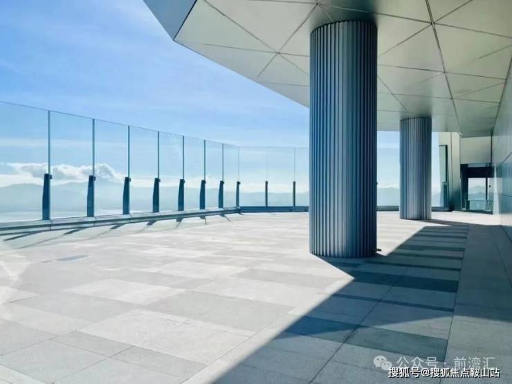 “天空之镜”是深湾睿云中心超总国际会客厅的重要一部分,是深圳目前最高的露天观景平台。站在360米的云端,可以360度俯瞰深圳疏密有致的城市景象。“天空之镜”采用的灰镜玻璃代表蓝天繁星,以白色石材代表白云,融入科技感十足的动态灯光设计,带来别具一格的高空体验。