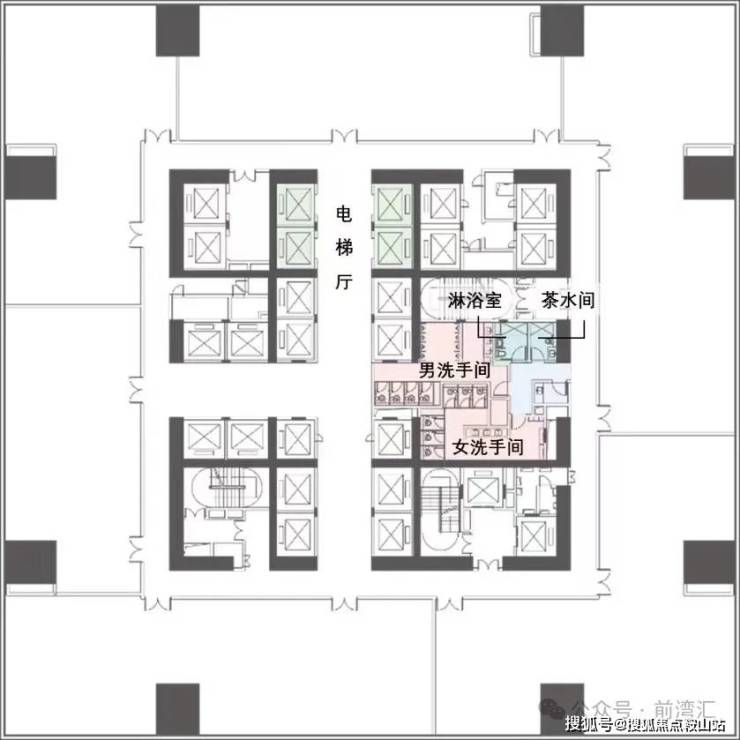 核心筒结构,户型方正。每层根据楼层划分为5−6个产权单位,部分楼层带双层挑高设计。
