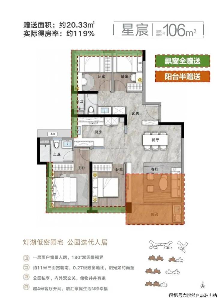 “星宸” 建面约 106㎡的四房两厅两卫户型,格局方正,两间卧室在同一侧,书房和另一间卧室在另一侧,书房的 270° 飘窗方便灵活调整空间布局。