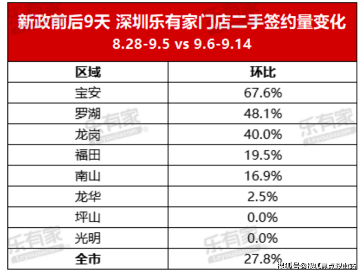 而中介机构则统计了深圳新政后9日的数据,即9月6日~9月14日,全市二手房签约量环比增长27.8%。其中,宝安、罗湖、龙岗的二手房签约量位居前列。