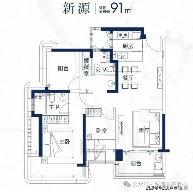 91㎡的3房2厅2卫,设计的是经典竖厅格局,进门入户玄关,客厅3.3米开间,LDKB一体化设计,动静分区,三开间朝南,主卧转角飘窗带1个设备平台,U型厨房,公卫三段式干湿分离,还带1个设备平台,得房率约89%(包含赠送),正南朝向。