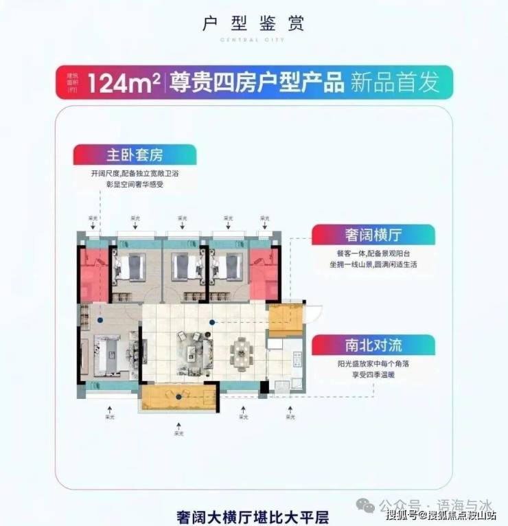 建面124平四房,四开间朝南,一线山景,南北对流横厅设计,开阔主卧。
