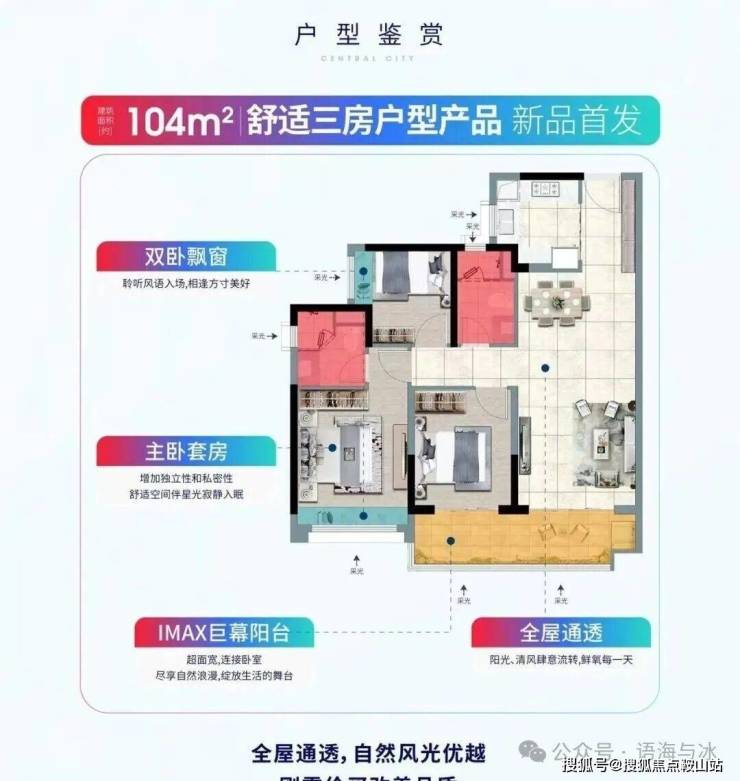 建面104平三房,全屋通透,大阳台设计,主卧套房格局,增加私密性。