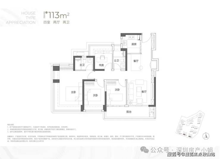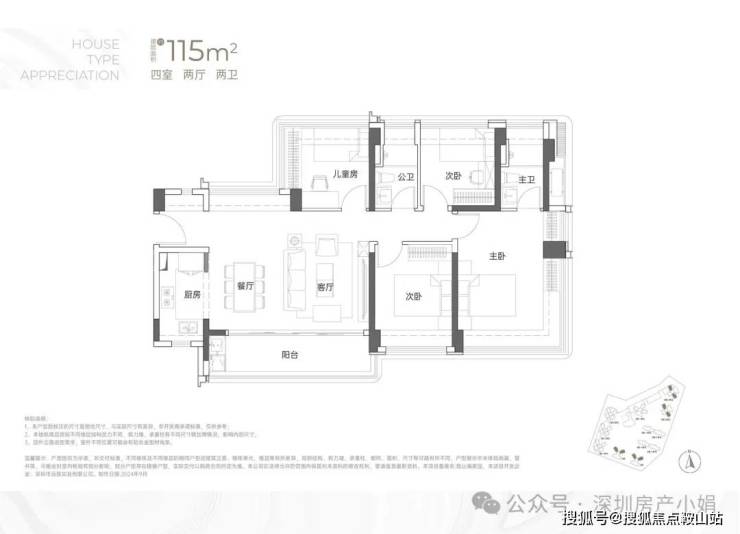 建面约115㎡ 四房两卫• 格局:横厅设计,三种户型贴合不同朝向,南北通透无遮挡,赠送率居首。• 亮点:餐客厅一体化,30㎡阔绰公共空间,搭配超大景观阳台;四开间朝南,全屋采光均匀,主卧套房设计,私密度拉满。