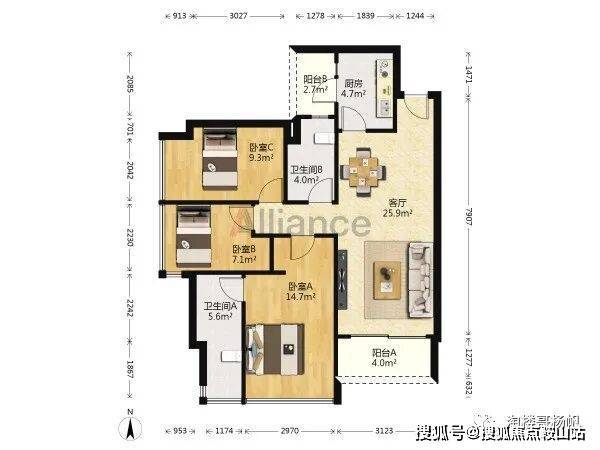 约110㎡:3+1房2卫,南北通透,灵动空间可作书房/儿童房;