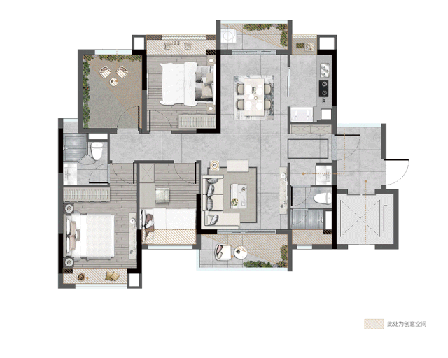 展开户型图,不难发现,飘窗、阳台、小房的超高赠送面积,加之 全屋0过道设计,为整个户型挤出了更多的打造空间, 建面约87㎡不仅做到了3房,三个房间都不小,摆放1.8米床绰绰有余, 并且拥有主卧套房设计,加上双L型270°卧室飘窗, 以及阳台、创意空间的超高赠送面积,为整个户型腾出了更多空间, 多个爆点聚变,成功点燃中山市场, 成为当下万众青睐的户型爆款。