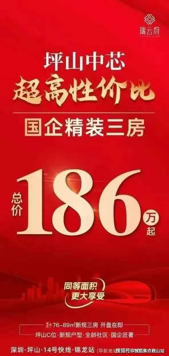 坪山沙湖,【天健瑞云府】于2025年4月3日取证入市,本次将首推2栋1单元住宅,共210套房源,面积有76㎡的3房1卫,85-89㎡的3房2卫户型。