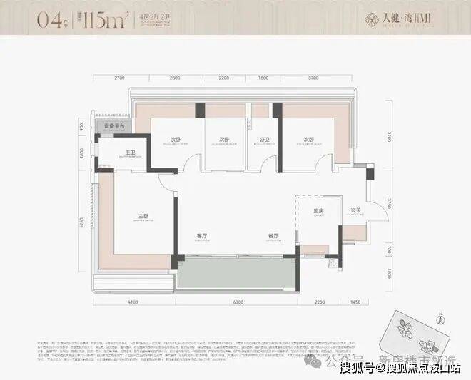 横厅设计,进门处玄关宽敞,客餐厅跟厨房一体化,115平户型的升级版,客厅旁边多一个次卧房间,主卧套房设计,L型拐角飘窗双面采光,兼顾实用与美观。