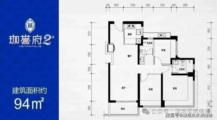 94㎡的3房2厅2卫,设计的是竖厅格局,动静分区,客厅3.4米开间,S墙设计预留冰箱卡槽位,3个卧室分别为3.7/2.7/2.35米的宽度,主卧270°环幕飘窗视野,U型厨房,得房率:77.54%(不含赠送),阳台进深1.6米,西南朝向。