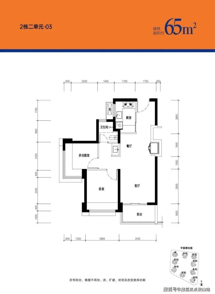 65㎡的2房2厅1卫,设计的是竖厅格局,LDKB一体化,客厅3.1米开间,S墙设计预留冰箱卡槽位,2个卧室分别为2.8/2.35米的宽度,U型厨房,得房率:77.27%(不含赠送),阳台进深1.6米,东北朝向。