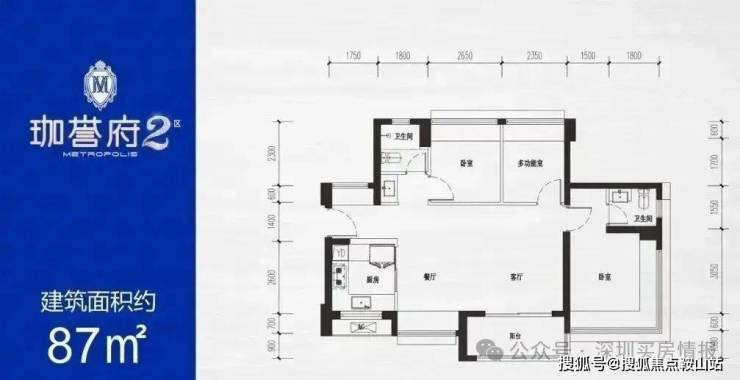 87平米,设计的是横厅南北通透格局,客餐厅6.2米开间,3个卧室分别为3.3/2.65/2.35米的宽度,主卧270°环幕飘窗视野,U型厨房,得房率:77.54%(不含赠送),阳台进深1.7米,主朝东南朝向。