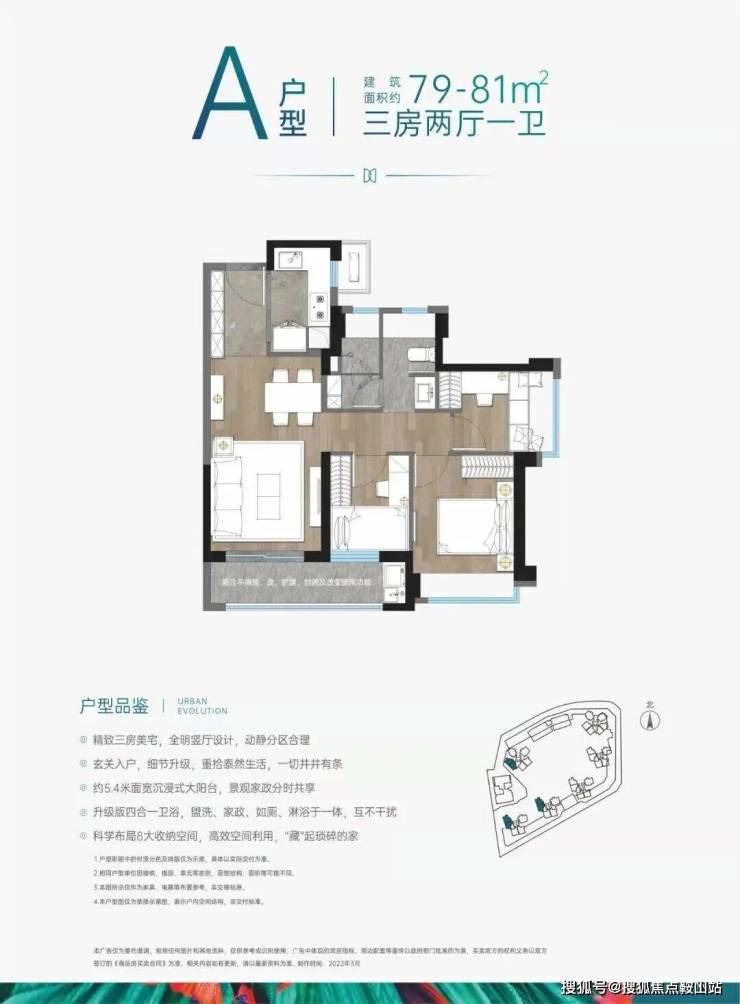 以建面约 79—81㎡三房两厅一卫户型为例,极致的空间利用率及强大的功能性,尽显人性化关怀。