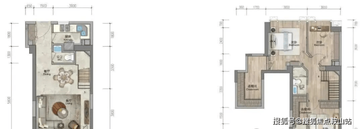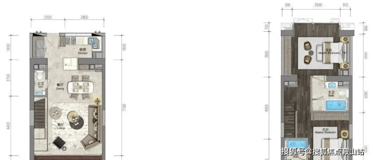 88㎡复式三房两厅三卫: 南北通透,5.4米大开间,复式下层餐厨客厅连宽景阳台,复式上层私密卧房全明采光,动静分区私享个性生活。