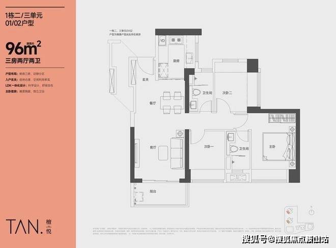 96㎡的3房2厅2卫,设计的是经典竖厅格局,LKDB一体化设计,进门入户玄关,动静分区,三开间朝南,有1个次卧做的双飘窗,U型厨房,全部西南朝向。